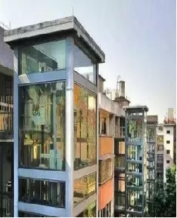 根据该小区楼栋建筑形式、结构特点,结合楼栋前窗间距、楼道间距等基本技术参数,确定采用贴附式(横式)半层入户电梯安装方案,即采用独立钢筋混凝土基础钢结构主体,电梯安装在单元门口正前方,钢结构主体与楼梯采用柔性连接。电梯候梯厅和原楼梯休息平台相连,安装尺寸为长4.0m×宽2.6m。采用380V无机房曳引式450公斤级标准基坑乘客梯,电梯井道位置外墙采用透明玻璃幕墙,候梯厅采用磨砂玻璃幕墙,有效保证居民采光和隐私问题,提升居民满意度。