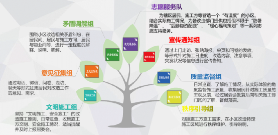 建组织。北小园小区党员、志愿者、楼门长等骨干成员共同成立“6组1队”居民组织,包括通知宣传组、意见征集组、秩序引导组、矛盾调解组、文明施工组、质量监督组以及志愿服务队,明确工作职能,确立“一组牵头,全体配合”工作模式。社区组织党员、网格员、“6组1队”成员上门走访,解释相关政策,化解意见分歧,协调最优方案。