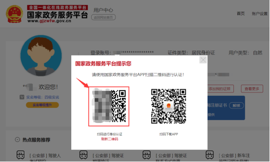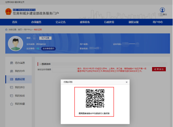 点击证照,在弹出的页面中按提示使用“国家政务服务平台”手机APP扫码进行身份认证。