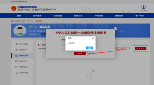 在弹窗页面继续点击[加注]按钮,提示“加注成功!”表示电子证照加注完成,加注有效期为180天。