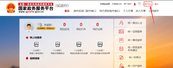 登录成功后,点击右上角[用户中心],进入用户中心页面。